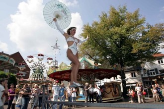 Wenn man hört, dass die Artistenfamilie Traber nach Dinslaken kommt, dann erwartet man atemberaubende Artistik auf dem Hochseil in extremer Höhe. Die Besucher der Dinslakener Nostalgiekirmes, die ihren Blick daher schon in Richtung der Dächer rund um den Altmarkt schweifen ließen, sahen sich da erst einmal umsonst um. Denn zwar war die Artistenfamilie Traber gekommen, allerdings jene vom Circus Traber. Und obwohl Daniela Traber sich aufs Drahtseil wagte und dort einige Kunststücke zeigte, so blieb das ganze knapp einen Meter über dem Boden auch für Zuschauer mit Höhenangst erträglich.