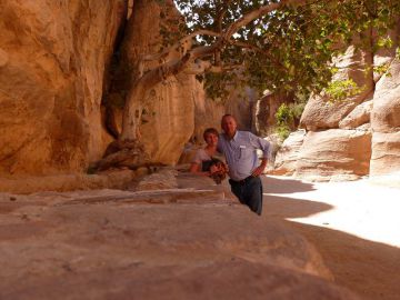 Durch den Siq, eine über 70 m tiefe und 1,5 km lange Felsschlucht geht es zum Eingang der Felsenstadt Petra.