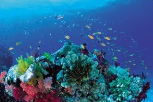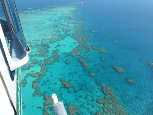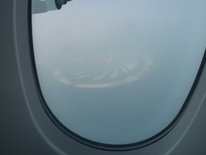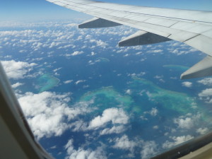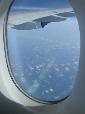 Nach vier Flugstunden überfliegen wir in knapp 12.000 Meter Höhe die "Malediven", ein traumhaft schöner Anblick.