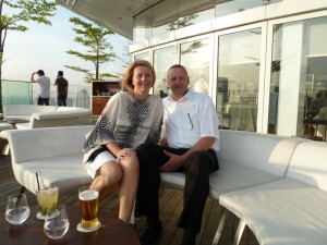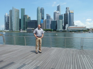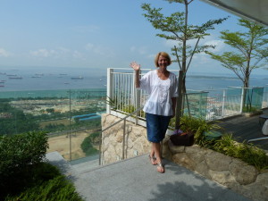 360° Rundumsicht aus dem "Singapur Flyer". Richtung Süden sind einige indonesische Inseln zu sehen, Richtung Norden reicht die Sicht bis nach Malaysia. Im Hintergrund nochmal das "Marina Bay Sands"
