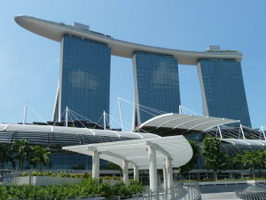Das Marina Bay Sands, ein aus Kasino und Hotel bestehendes Resort an der Marina Bay. Das 2010 eröffnete Resort, bestehend aus drei 55-stöckigen Türmen, gilt als die teuerste, alleinstehende