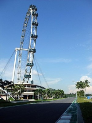 Der "Singapur Flyer" direkt neben der Formel- 1-Rennstrecke "Marina Bay Street Circuit" ist mit 165 Metern Höhe zur Zeit das größte Riesenrad der Welt.